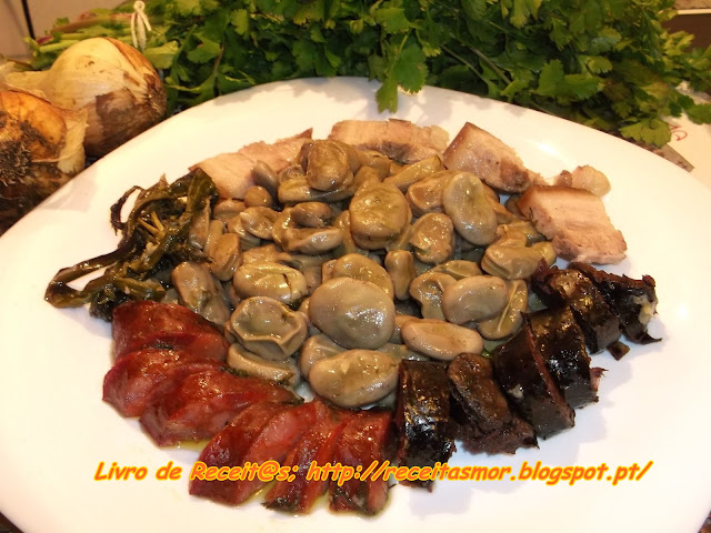 Colocar um tacho ao lume a aquecer. Juntar o azeite a cebola partida aos bocadinhos e o dente de alho. Deixar alourar e colocar os enchidos (dei uns golpes nos chouriços), o toucinho entremeado partido ás tiras largas e o ramo dos cheiros (atado com fio de cozinha). Tapar o tacho e deixar ferver para suar um pouco. De seguida juntar as favas, o sal e um copo com água quente. Deixar cozer bem durante uns 20 minutos, até as favas estarem tenrinhas.